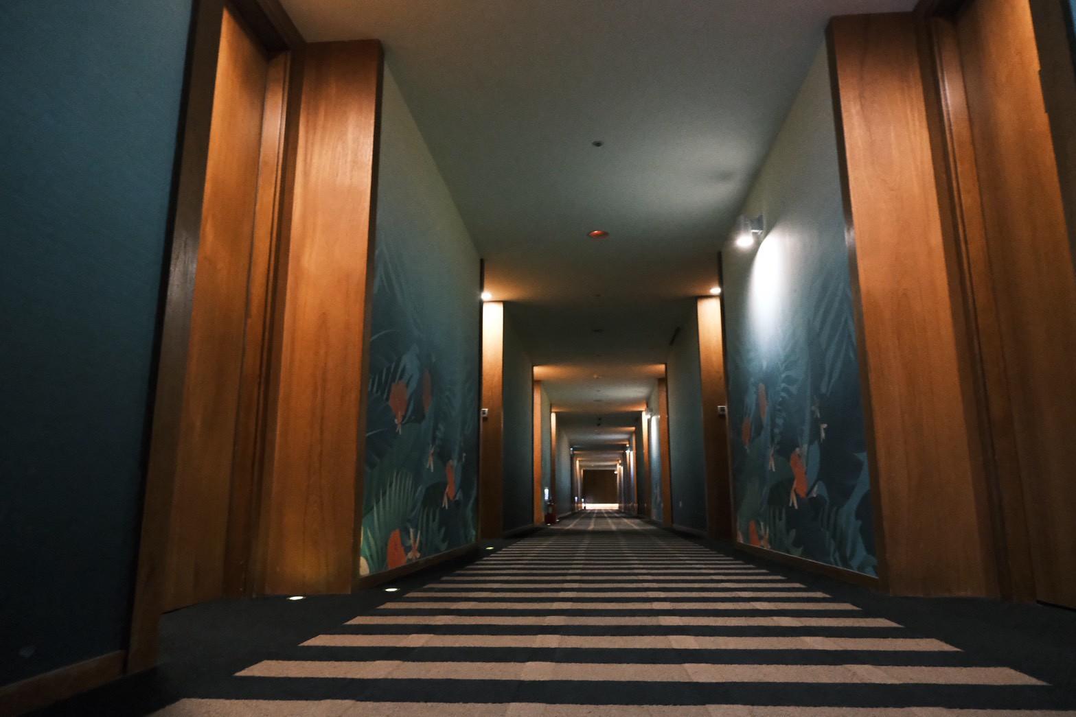 進入房間前,會先經過一段超可愛的海底世界彩繪走廊,就像走在水族館裡。而進房後,大片採光窗戶將外頭的一片翠綠與城市天際線連成一線,在房裡就能感受到滿滿的芬多精。