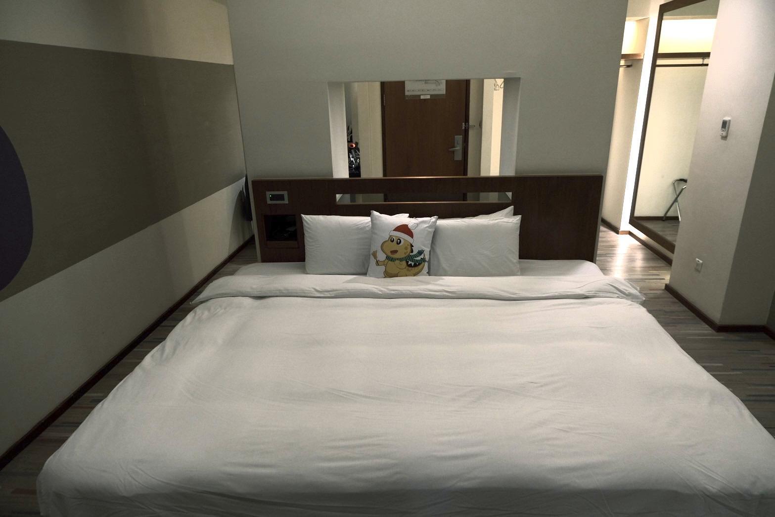 房間的設計簡潔溫馨,床上還有吉祥物抱枕,讓整個空間多了一份童趣,非常適合家庭客或想放鬆的小資族。