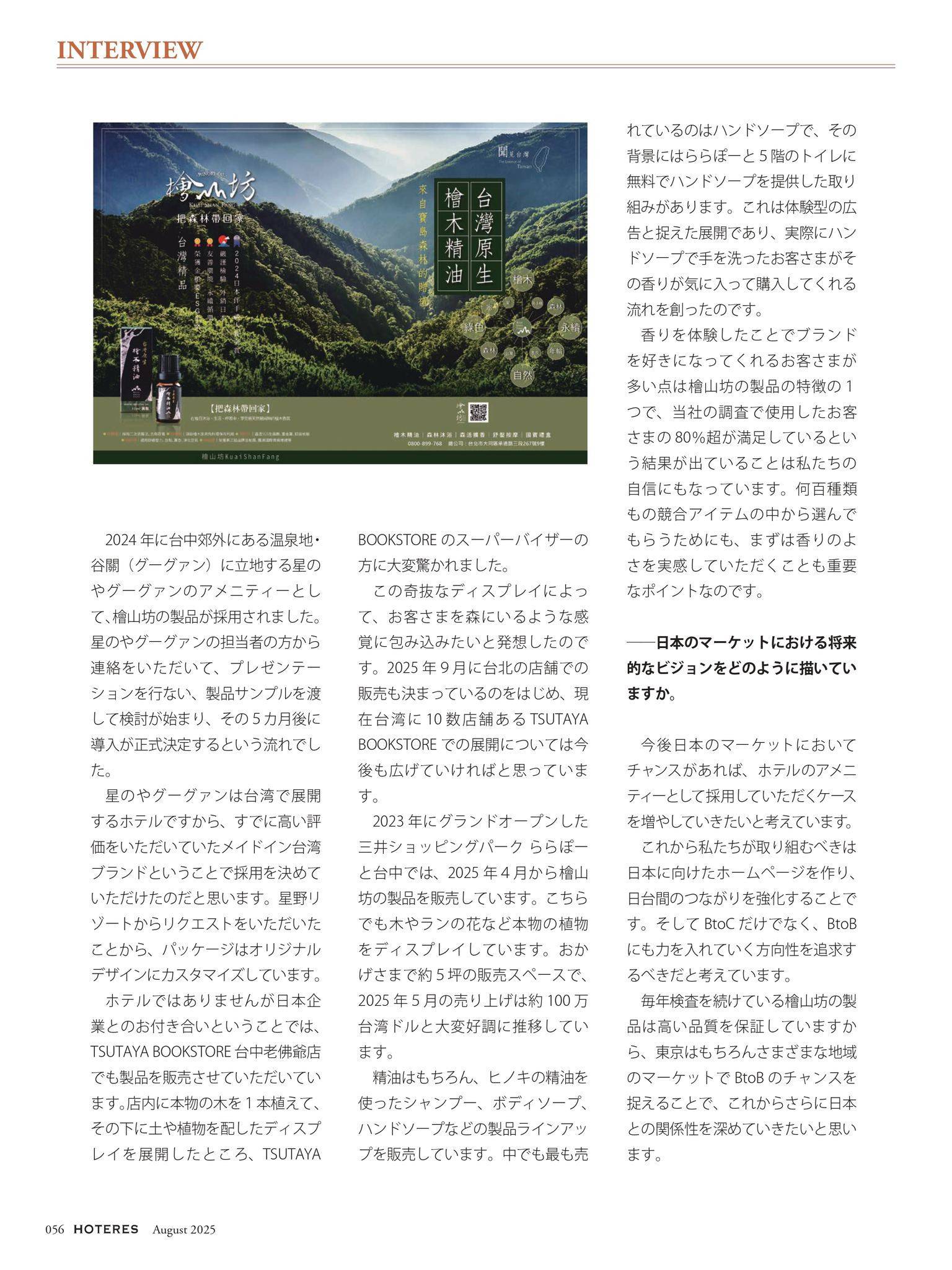 近年來,我們更持續拓展海外版圖。2024 年年底,日本星野集團在台中虹夕諾雅谷關的六星級溫泉度假村正式選用檜山坊洗沐用品作為客房備品,象徵檜山坊的品質獲得肯定,這是邁向日本市場的重要一步;同時,我們也與 KU FLOWER 團隊合作植栽造景,在 TSUTAYA BOOKSTORE 台中市政店 打造植栽香氛陳列,獲得顧客與業界顧問的高度評價。