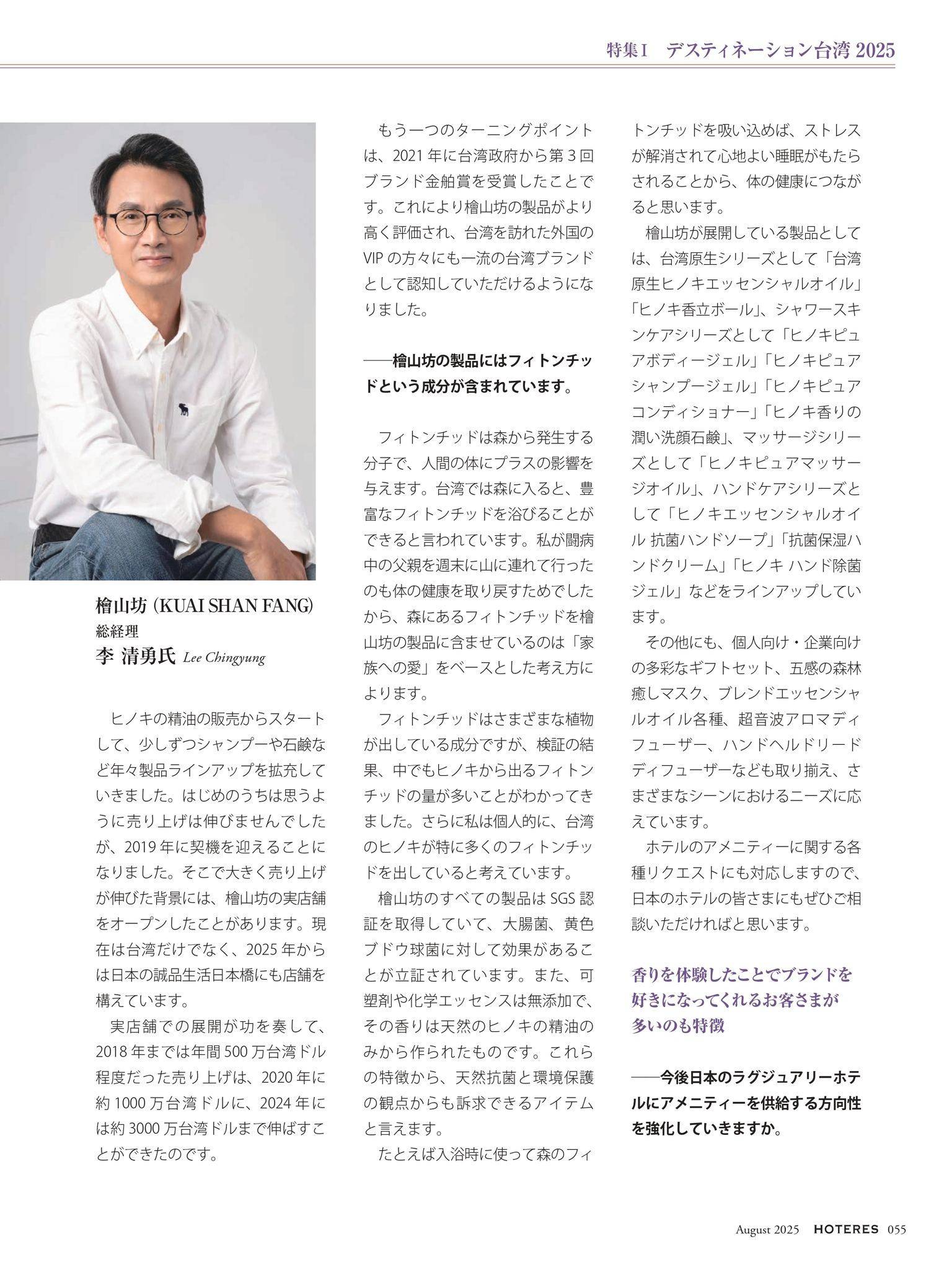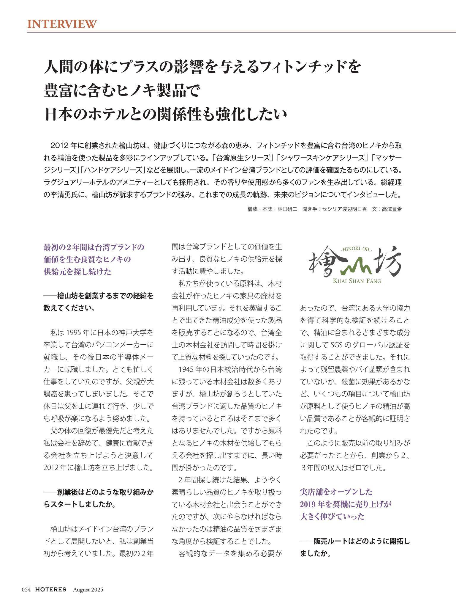 HOTERES のインタビューでは、創業者の李清勇(リ・チンヨン)総経理がこれまでの歩みを振り返りました。2012 年の創業以来、檜山坊は台湾ヒノキ(タイワンヒノキ)の研究と活用に力を注いできました。精油、ヘア&ボディケア、マッサージオイル、石けんやアロマディフューザーまで──すべての製品には「森を家に持ち帰る」という想いが込められ、日常に森林の癒しを届けています。