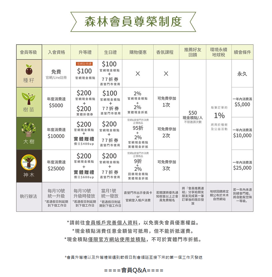 森林會員一共分為種籽會員、樹苗會員、大樹會員和神木會員四個等級。讓我們一起從小種籽開始茁壯吧!