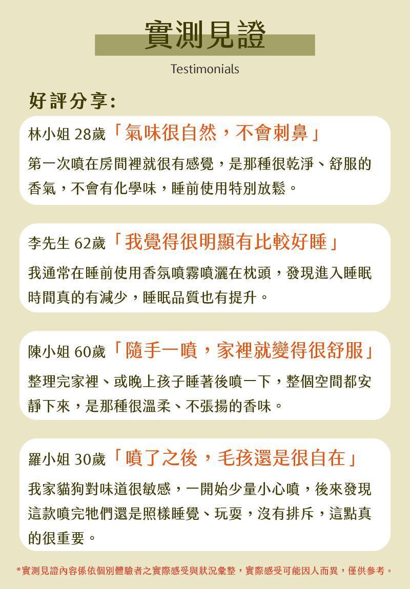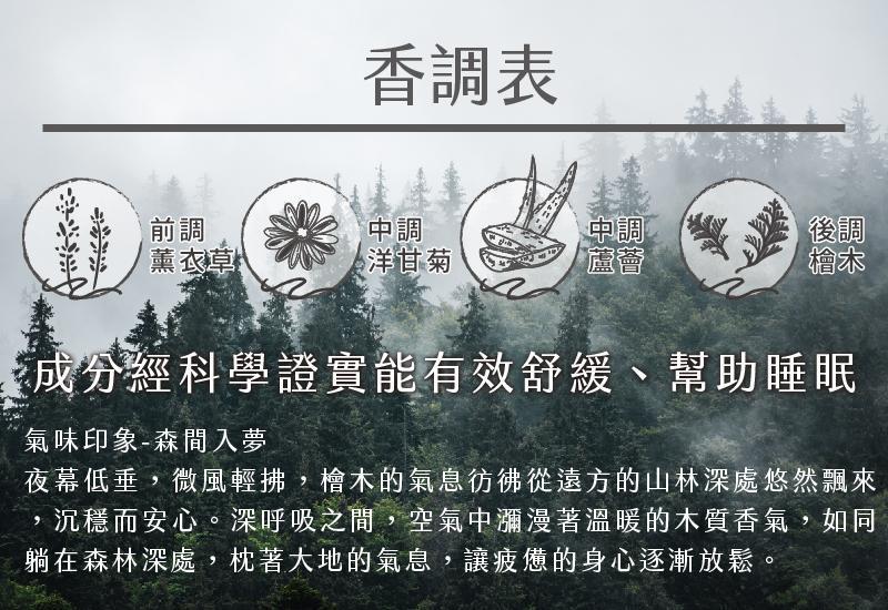 嚴選純天然 檜木精油、洋甘菊精油、薰衣草精油,氣味溫和不刺激,有助於放鬆緊繃情緒,營造適合入睡的安定氛圍。